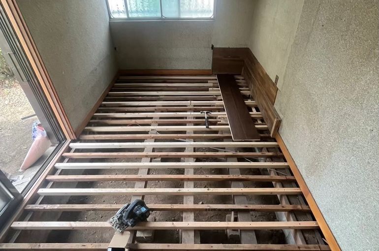 沈んでいる部屋はフローリングを撤去し、根太など補強!