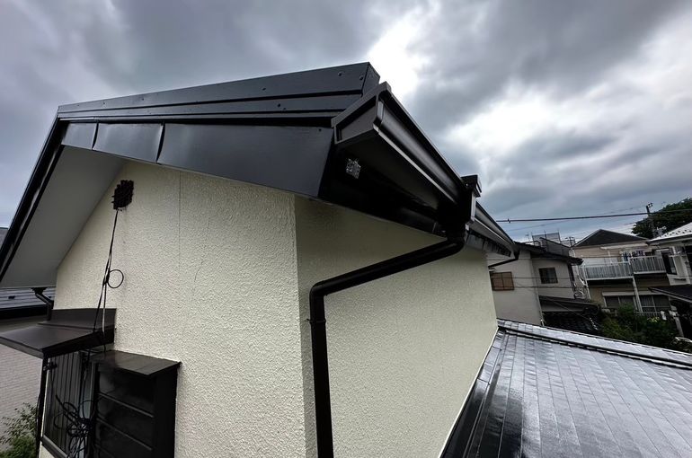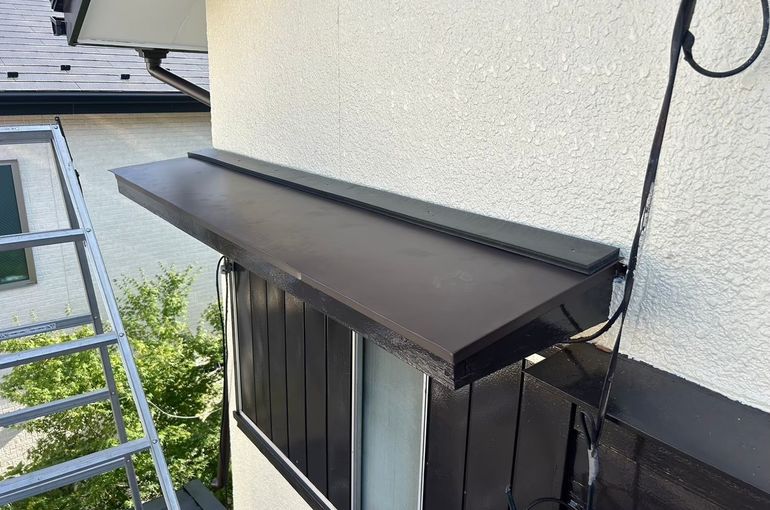 板金撤去後、ベニアを張り→防水シート→水切り→板金を取り付け雨押さえを取り付け完了しました!
