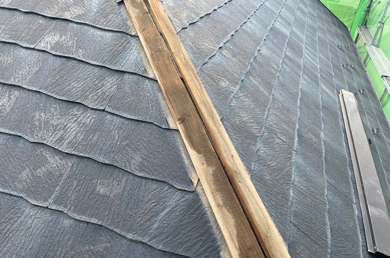 築年数は若めですが、屋根材のひび割れも多く、貫板も雨染みができてしまっています。