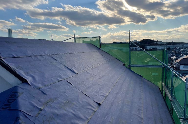 屋根材の上からルーフィングを張っていきます。