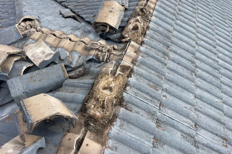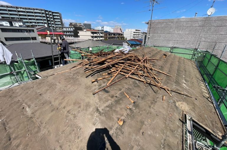 既存の瓦を撤去すると瓦と下地の間に鳥の巣やコウモリがいました。その他にも元々下地が入っていないとこなど屋根の状況はかなり悪かったです。。