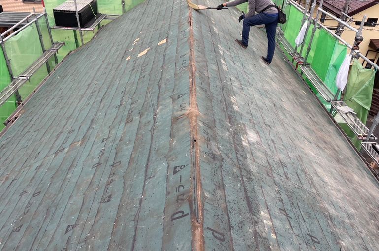 現調すると落ちていた部分の他にも劣化しており各所でひび割れしていたので、葺き替え工事をしました!