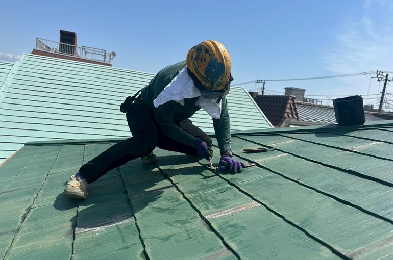 屋根材にカッターやスクレーパーなどを入れてシーリングを切っていきました!