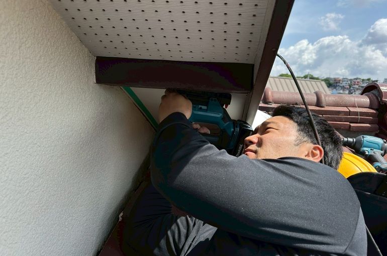 動物が侵入してしまうと屋根裏にかなりのダメージがいってしまうのでこの部分だけではありましたが既存の軒天を剥がして新しいものに張り替えました!