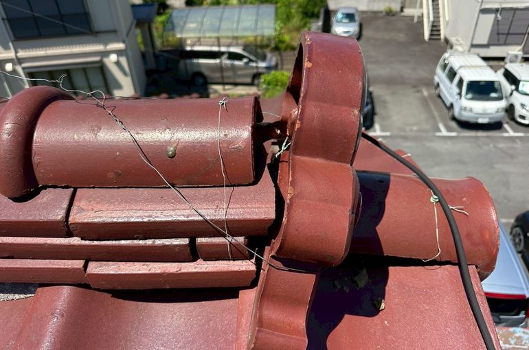 棟の漆喰が多く剥がれていたり瓦を留めている銅線が切れていたりなど状態は良くありませんでした。