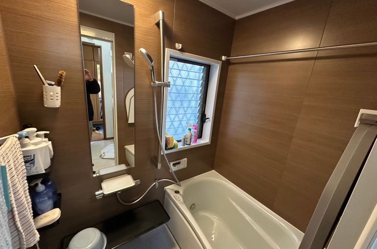 壁は暗めの木目調のミディアムウッドを使用し浴槽や床は明るめのライトグレーなどを使用して落ち着いた雰囲気でカッコいい感じにしました!