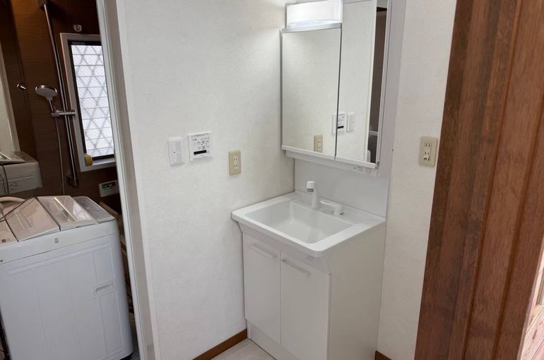 化粧台も変え壁など汚い部分もあり空間を全体的に明るく綺麗にしたいので床や壁紙なども張り替えました!