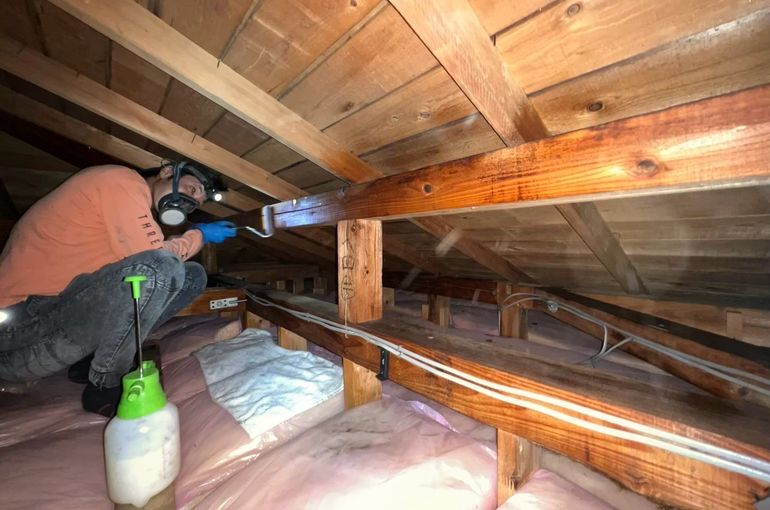 湿気や結露が原因で木部にカビなど生えたりしており菌を増やさない為や防虫対策にもなるオプティガード20ECにて消毒工事をおこないました!
